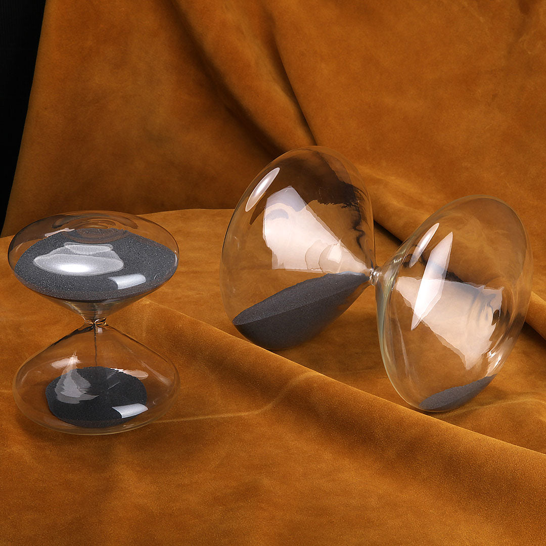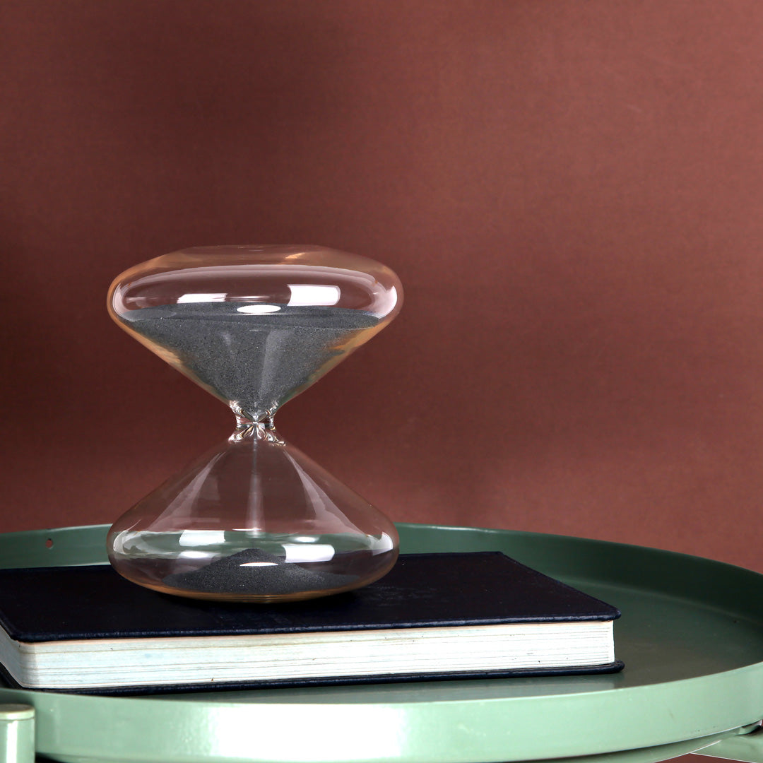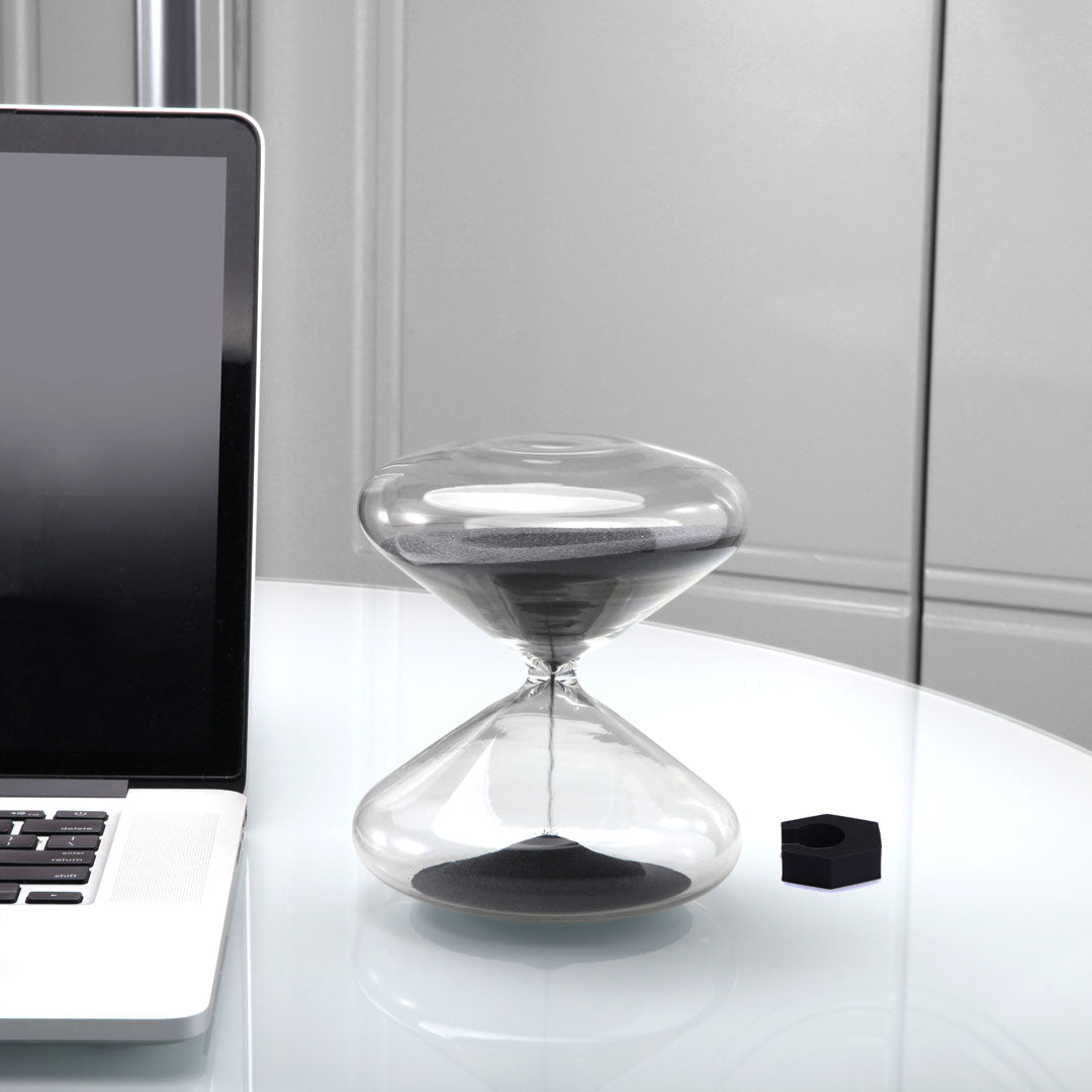 Each glass is hand-blown borosilicate glass (like pyrex). Borosilicate glass is a type of glass that contains boron trioxide which allows for a very low coefficient of thermal expansion. This means it will not crack under extreme temperature changes like regular glass. It's a standard 25-minute timer designed for the Esington timeboxing method (similar to the Pomodoro method with a few cue differences).